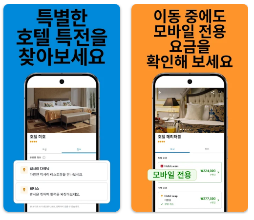 - 일부 호텔은 앱에서만 적용되는 모바일 전용 특가를 제공합니다.