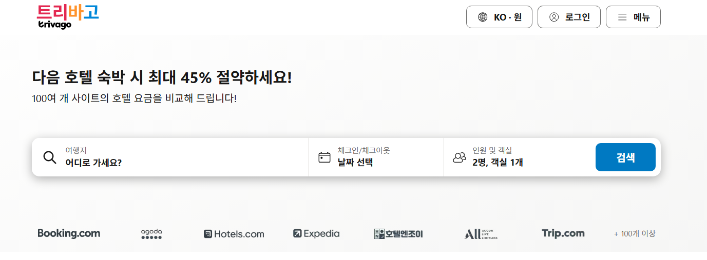트리바고는 전 세계 호텔 예약 사이트들의 가격과 조건을 비교하는 메타서치 서비스입니다. 여러 예약 사이트의 가격을 한 번에 비교하여 원하는 숙소의 최적의 요금을 찾아주는 역할을 합니다.